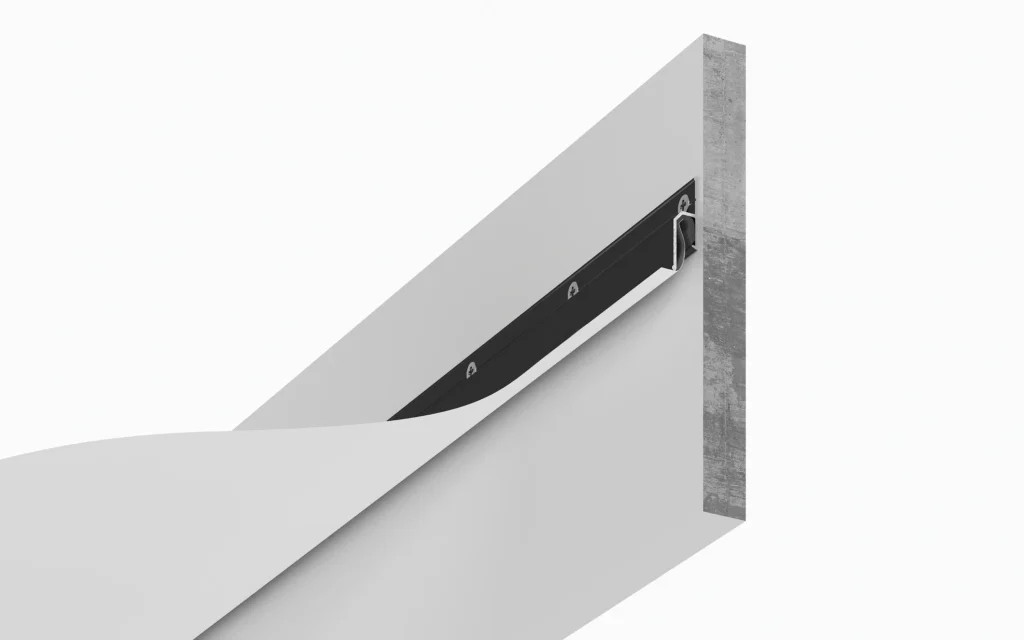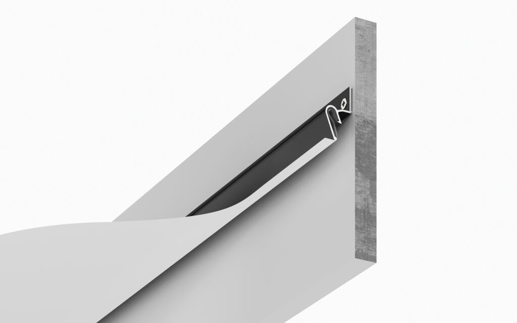 Profilul eurocrab este un sistem de montaj din aluminiu care elimină complet nevoia de plintă decorativă între tavan și perete. În locul ei, între membrană și perete rămâne un zăzor uniform de 6 mm — o linie de umbră care creează efectul vizual de tavan „plutitor”, desprins de pereți.