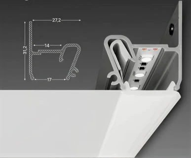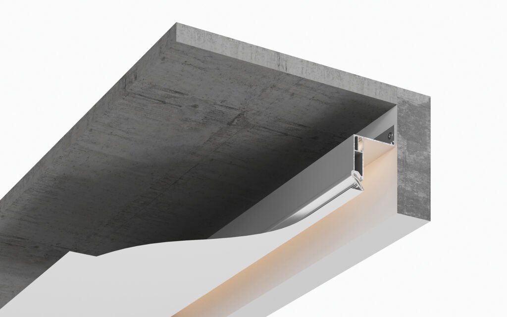 Profil în formă de „S”, pentru a crea un efect „plutitor”. Are un spațiu lateral pentru banda LED, care poate fi închis